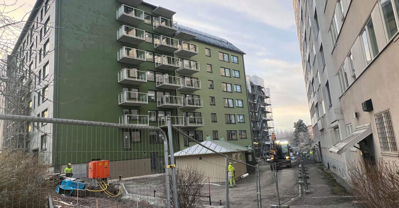 Utanför de entréer som först blir inflyttningsklara pågår markarbeten. Här skapas en trivsam miljö som gör att de första boende möts av en välkomnande känsla redan från första dagen.