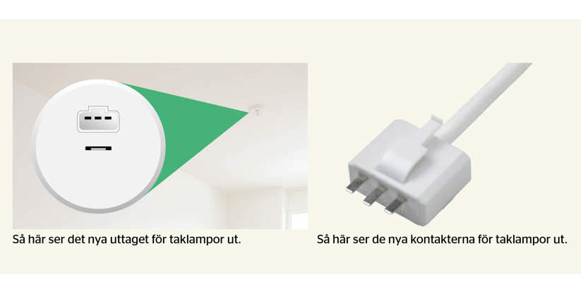 Snart får din lägenhet en modern el-central, nya strömbrytare och eluttag. Vi byter också uttagen för taklampor till den nya EU-standarden, DCL. För att dina taklampor ska passa i de nya uttagen behöver kontakterna bytas. Du får nya kontakter av oss, men själva bytet gör du själv.